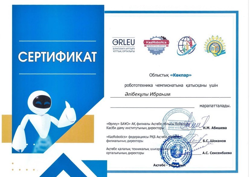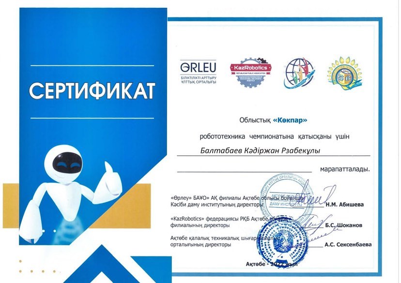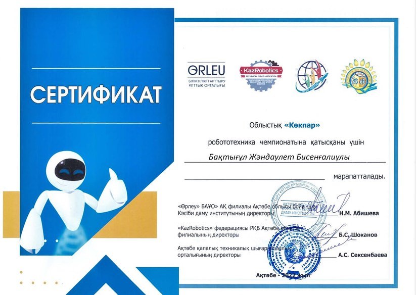 2022 жылдың 10 желтоқсанында Ақтөбе облысы білім басқармасы "Қазақстандық білім беру және спорттық робототехника "KazRobotics" федерациясы" республикалық қоғамдық бірлестігінің ұйымдастыруымен өткен "Көкпар" облыстық чемпионатына үйірме жетекшісі А.Жалгасбаеваның жетекшілігімен "Робототехника" үйірмесінің оқушылары Ж.Бақтығұл, К.Балтабаев, И.Әлібекұлы, Қ.Жұмабеков барып, бақтарын сынады.