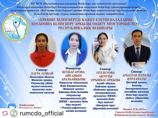 2023 жылғы 27 қаңтар. ҚР Оқу-ағарту Республикалық қосымша білім беру оқу-әдістемелік орталығы курстан кейінгі қолдау жұмыстары аясында «Ерекше білім беруді қажет ететін балаларды қосымша білім беру арқылы оқыту мен тәрбиелеу» тақырыбында Республикалық вебинар өткізді.