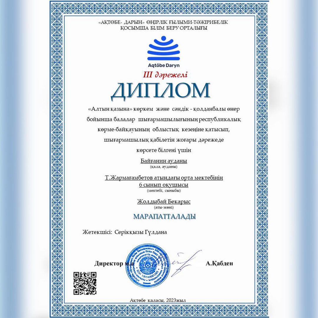 "Ақтөбе-Дарын" өңірлік-ғылыми тәжірибелік қосымша білім беру орталығының өткізген "Алтын қазына" көркем және сәндік-қолданбалы өнер бойынша балалар шығармашылығының республикалық көрме-байқауының облыстық кезеңіне қатысқан